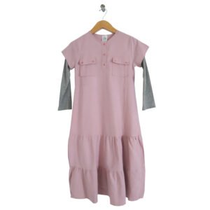 Lengan bahan KaosGamis Kesan 2pcs model anak dengan gamis bahan rami dan kombinasi bahan kaos dibagian lengan dengan model kancing depan dan model gamis berkerut tingkat dibagian bawah.dengan desain yang simpel dan bahan yang nyaman digunakan untuk sehari-hari.