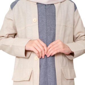 gamis dengan bahan katun Rami serta kombinasi motif salur halus serta model busui dengan resleting depan.