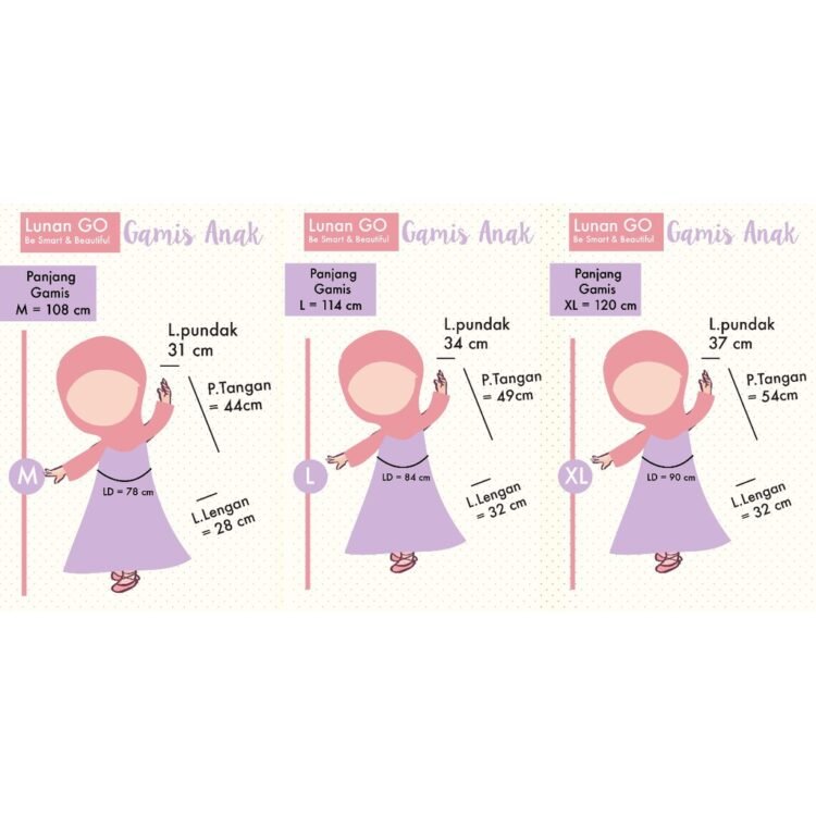 # Gamis Anak Lunan Go Full Katun Premium Quality memiliki 3 size yaitu size M ( LD : 78cm ) L ( 84cm ) Dan XL ( 90cm )