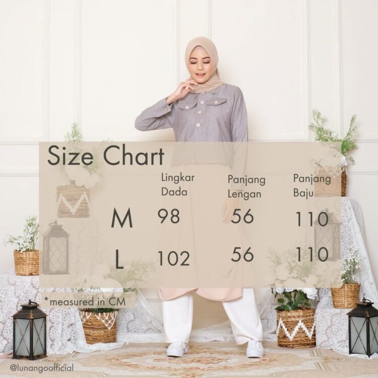 # Lunan GO Tunik Denim Mix Crepe LS 464 memiliki size All Size Fit To M ( LD 98 cm ) ( PB 110 cm ) L ( LD 102 cm )